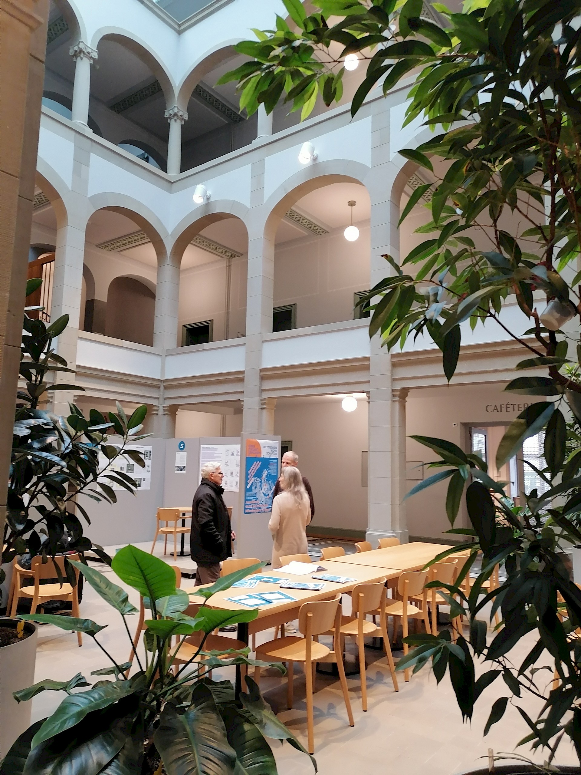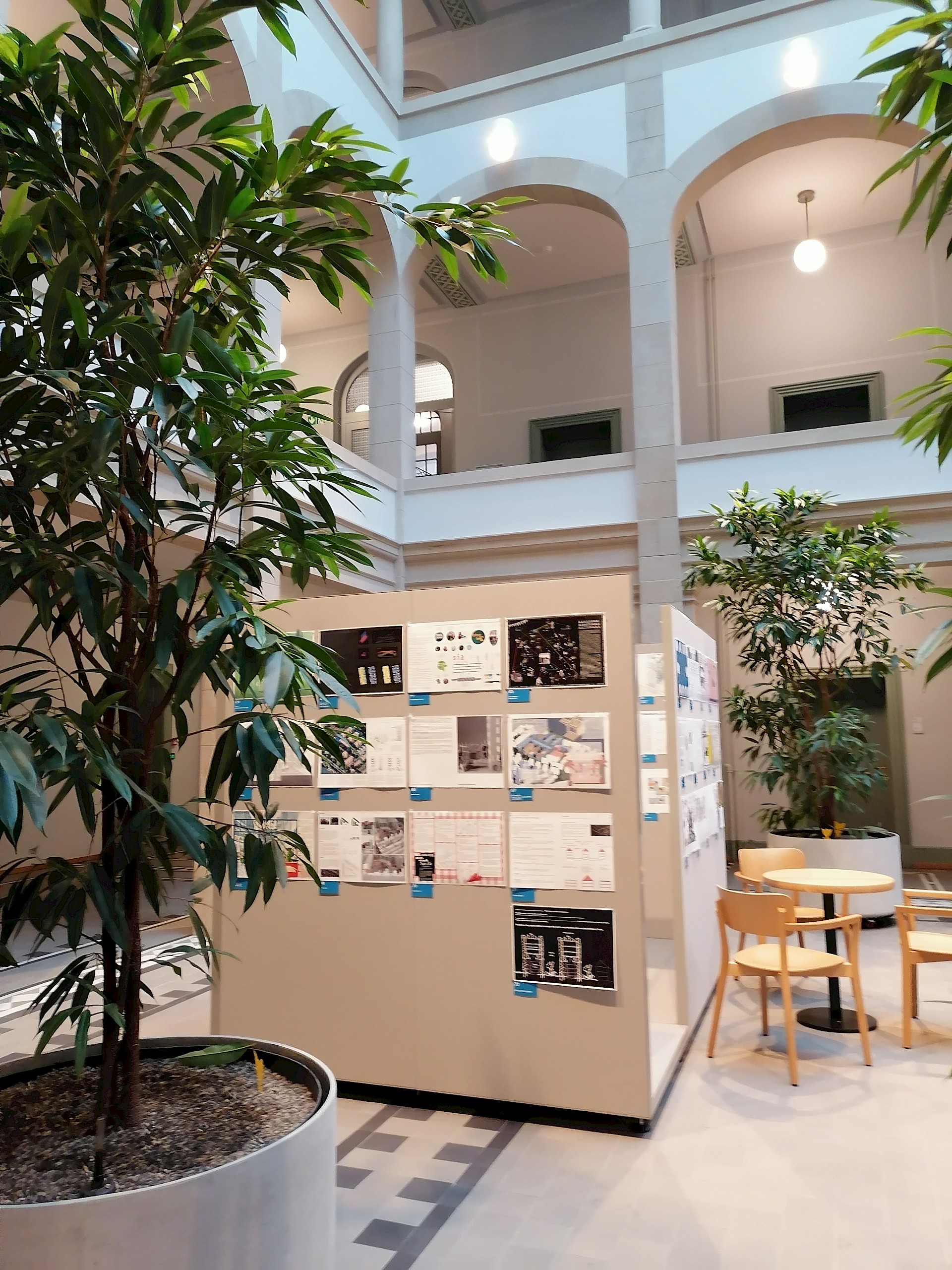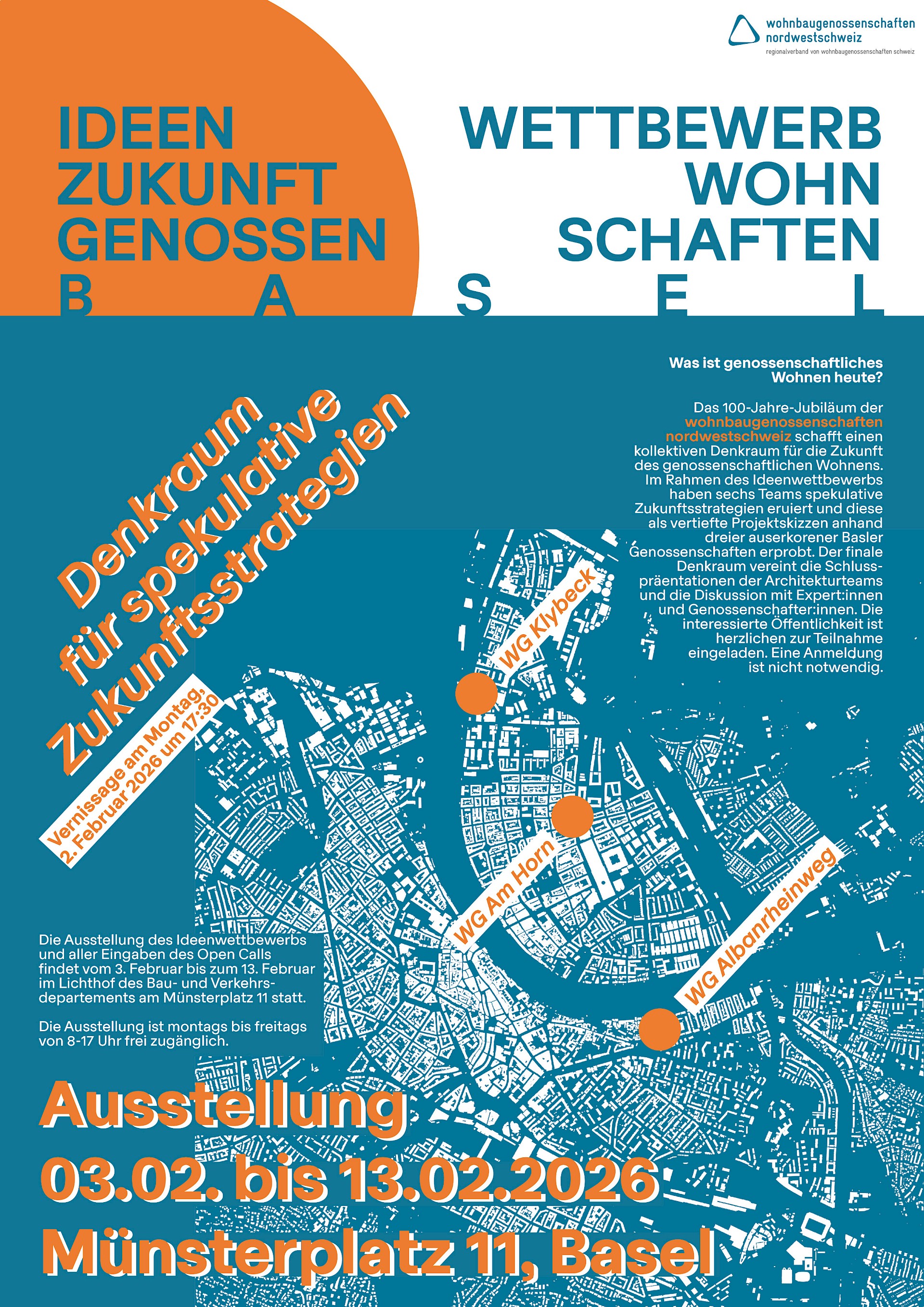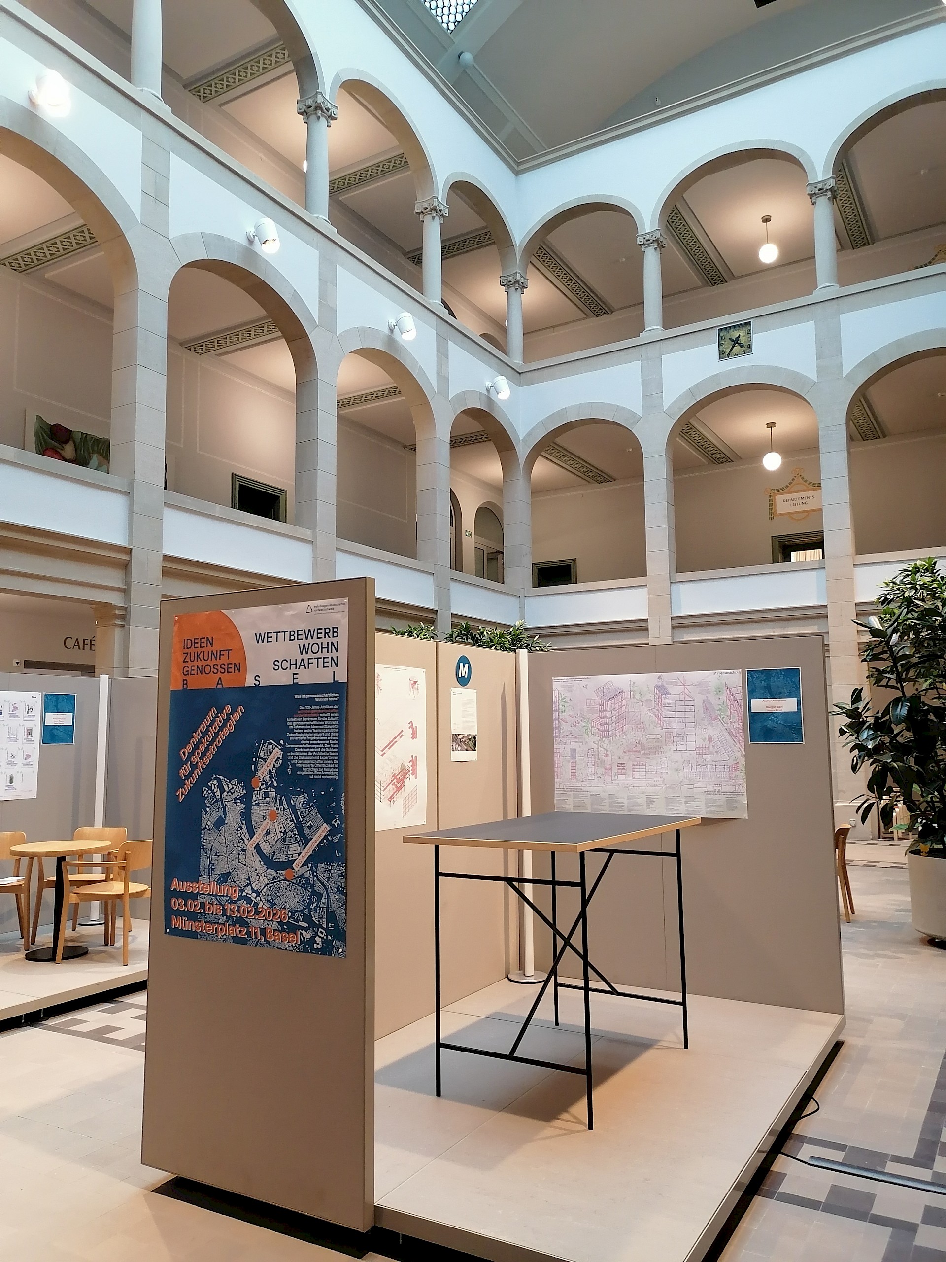Die Ausstellung im Lichthof des Bau- und Verkehrsdepartement zeigte die sechs vertieften Projektskizzen der ausgewählten Teams sowie alle Eingaben aus dem Open Call. Anhand dreier Basler Wohngenossenschaften werden unterschiedliche Zukunftsszenarien, Haltungen und Strategien sichtbar gemacht und zur Diskussion gestellt. Ergänzt wurde die Ausstellung durch die Dokumentation des Wettbewerbsverfahrens.